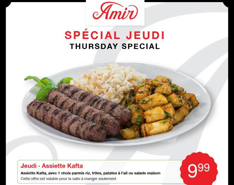 The menu at Amir - QC J7X 1A8 offers a range of Lebanese cuisine with options suitable for casual dining. It features a variety of platters, sandwiches, and trios that combine traditional Middle Eastern flavors with local elements.